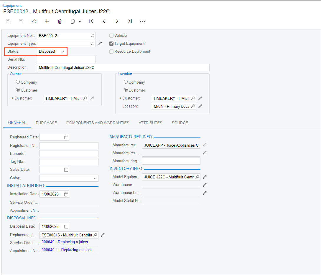 - On the Equipment that opens, review the details of the created equipment. In the Installation Info section of the General tab, you can find the reference numbers of the related service order and appointment.