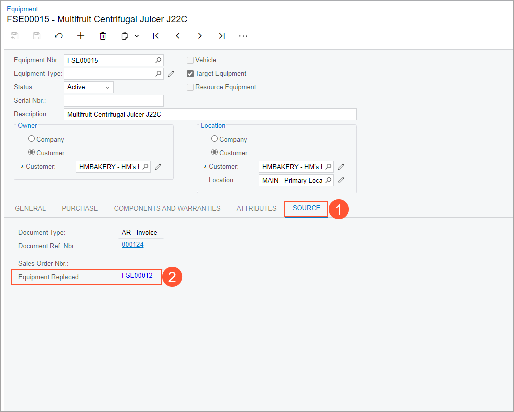 - On the Invoices form, click the equipment reference number in the Target Equipment ID column.