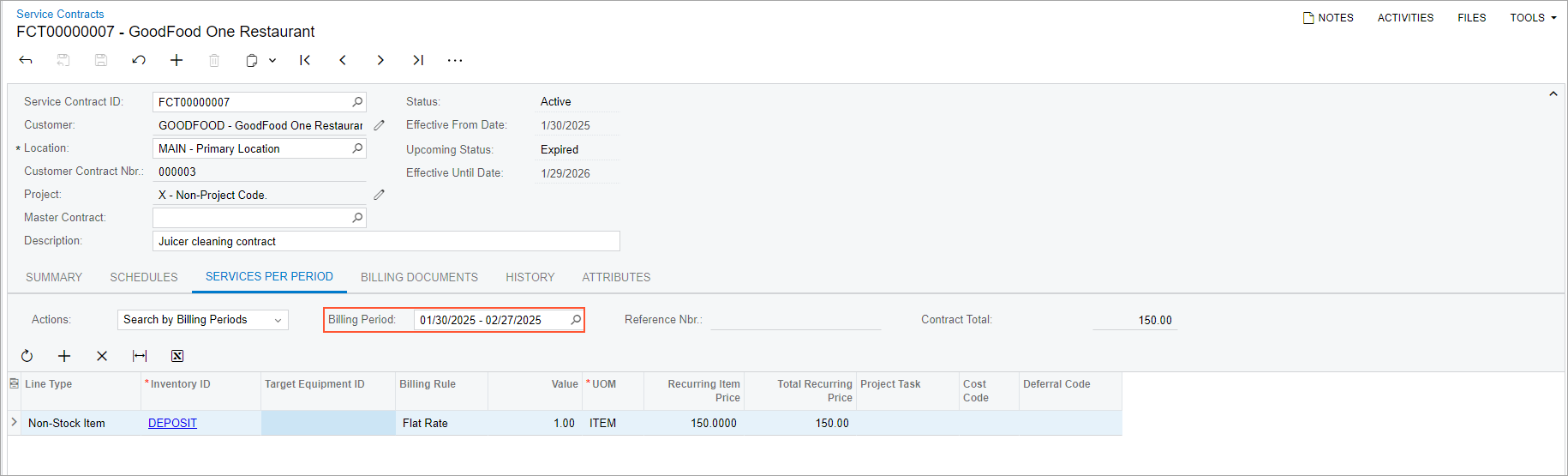 - On the Run Service Contract Billing (FS501300) form, in the Billing Customer box, select GOODFOOD - GoodFood One Restaurant.