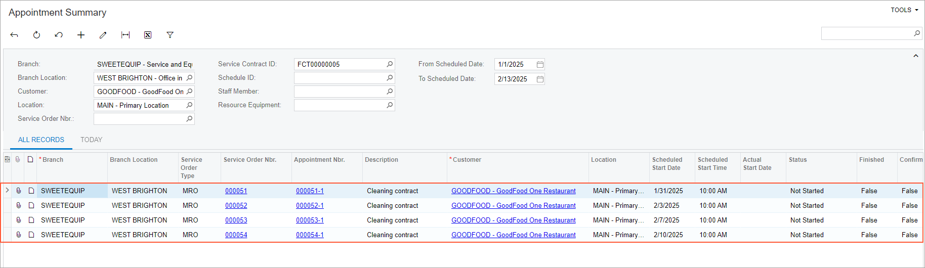 The list of appointments generated for the selected service contract is displayed in the table (see the following screenshot).