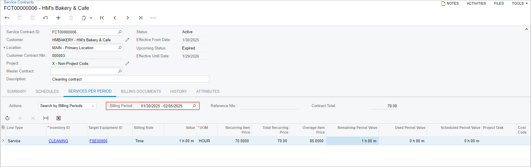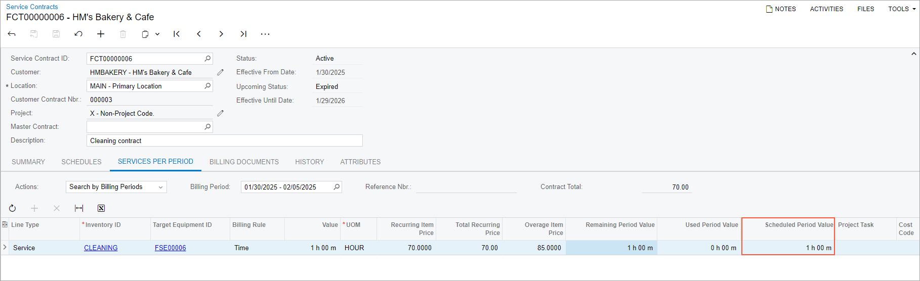 - On the Services Per Period tab of the Service Contracts (FS305700) form, notice that the Scheduled Period Value is now 1 h 00 m (as the following screenshot shows). This means that 1 hour of services has been scheduled for the selected billing period.