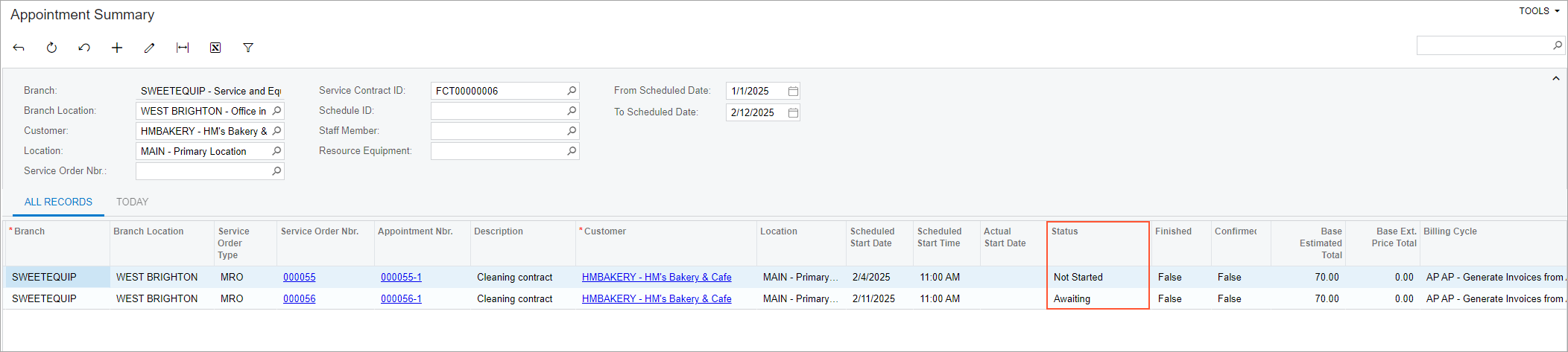 - In the To Scheduled Date box, select 2/12/2025.The form displays the appointments generated from the service contract. Notice that the appointment generated for the active billing period has the Not Started status, and the appointment generated for the future billing period has the Awaiting status (see the following screenshot).