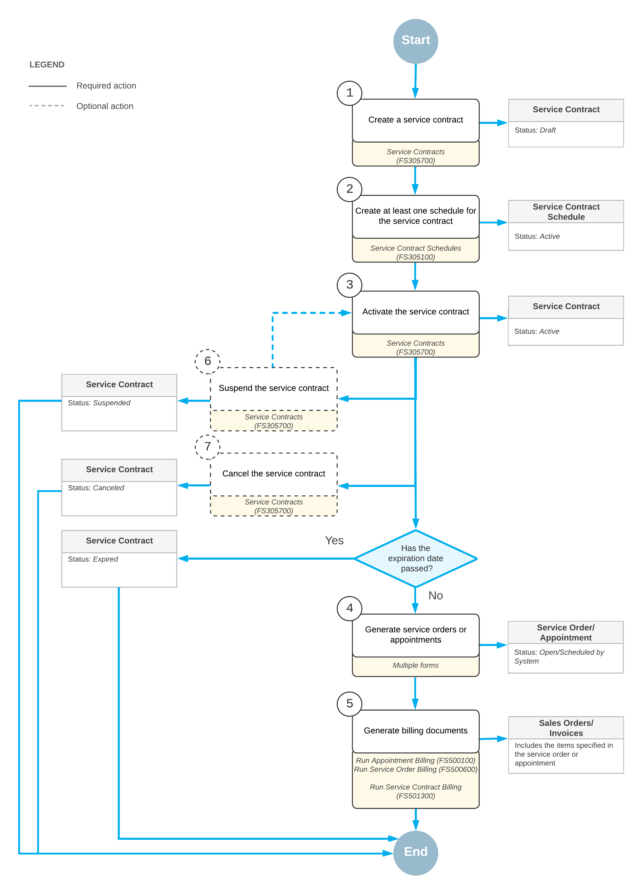 - Creating at least one schedule: By using the Service Contract Schedules (FS305100) form, the service manager creates a schedule (or multiple schedules) for the delivery of the services covered by the contract.