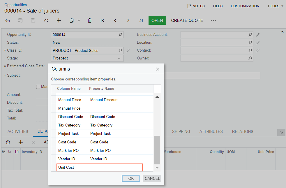 Suppose that for a table on a data entry form, you manually add a column from the Available Columns pane to the Selected Columns pane of the Column Configuration dialog box. Further suppose that the column appears in this table only if some feature is enabled on the Enable/Disable Features (CS100000) form. If the feature is disabled, this column does not appear in the list of matching fields in the Property Name column. Thus, you cannot match the column in the imported file to the column in the table on the form by using the Columns dialog box. As a result, the value of the column from the imported file cannot be inserted into the column in the table on the form.