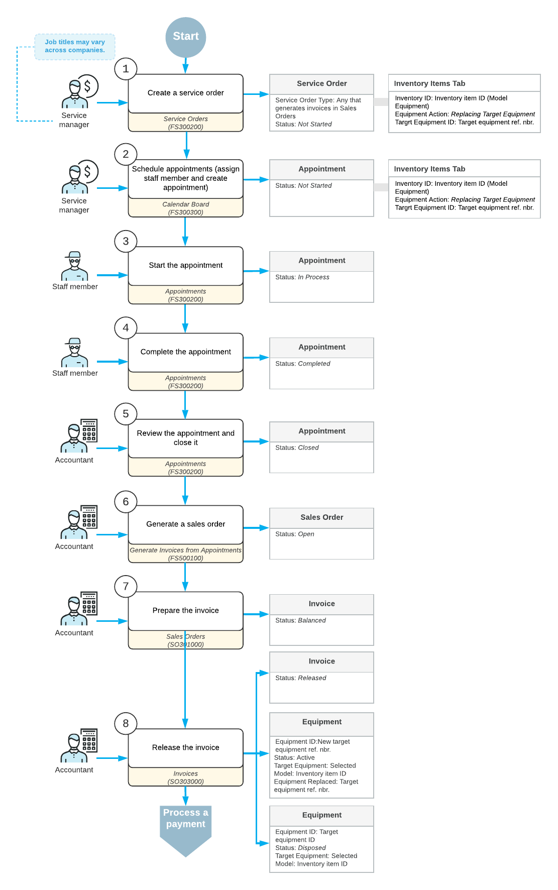 For the use case considered in this topic, suppose that the customer has requested a new equipment entity to replace an old one, along with replacement services from your company. A service manager of your company receives the request and enters it into MYOB Acumatica. Further processing is then performed by the scheduler, the assigned staff members, and the accountant who prepares invoices for the customer and processes them in the system.