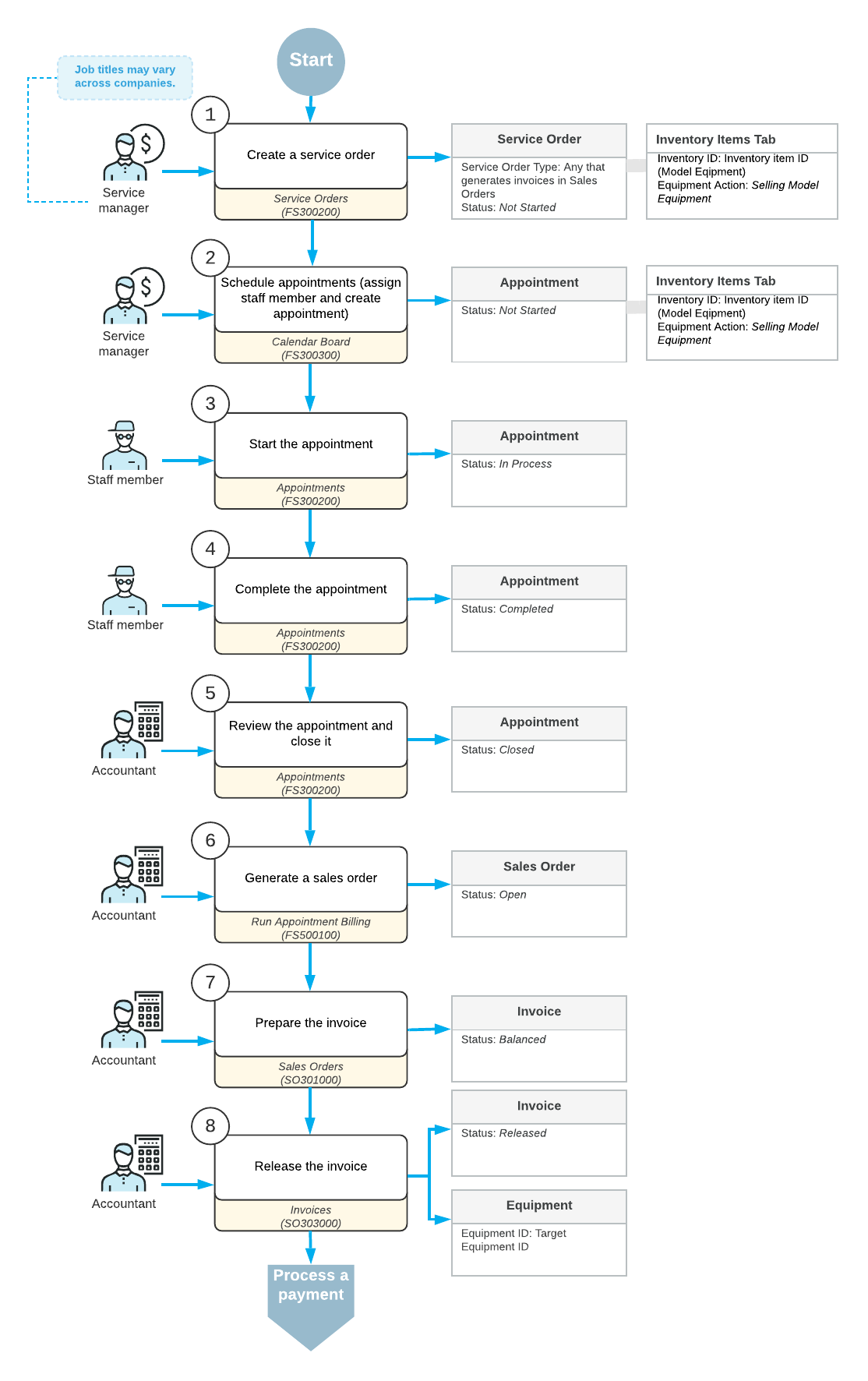 For the use case considered in this topic, suppose that the customer has requested a model equipment entity, along with installation services from your company. A service manager of your company then receives the request and enters it into MYOB Acumatica. Further processing is then performed by the scheduler, the assigned staff members, and the accountant who prepares invoices for the customer and processes them in the system.