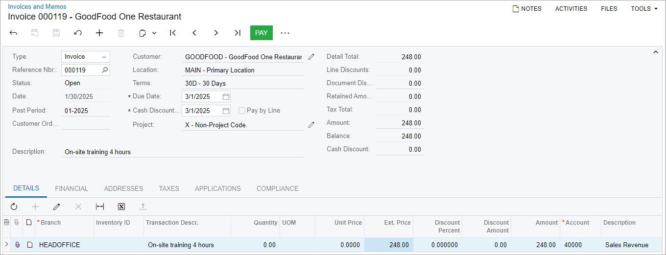 Suppose that today the GoodFood One Restaurant purchased four hours of on-site training from the SweetLife Fruits & Jams company for the amount of $248. Acting as a SweetLife accountant, you need to create an AR invoice for the customer and release the invoice.