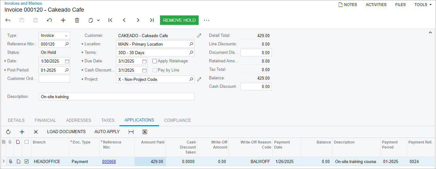 - While you are still on the Invoices and Memos (AR301000) form, click Remove Hold on the form toolbar. The system changes the status of the invoice to Balanced.