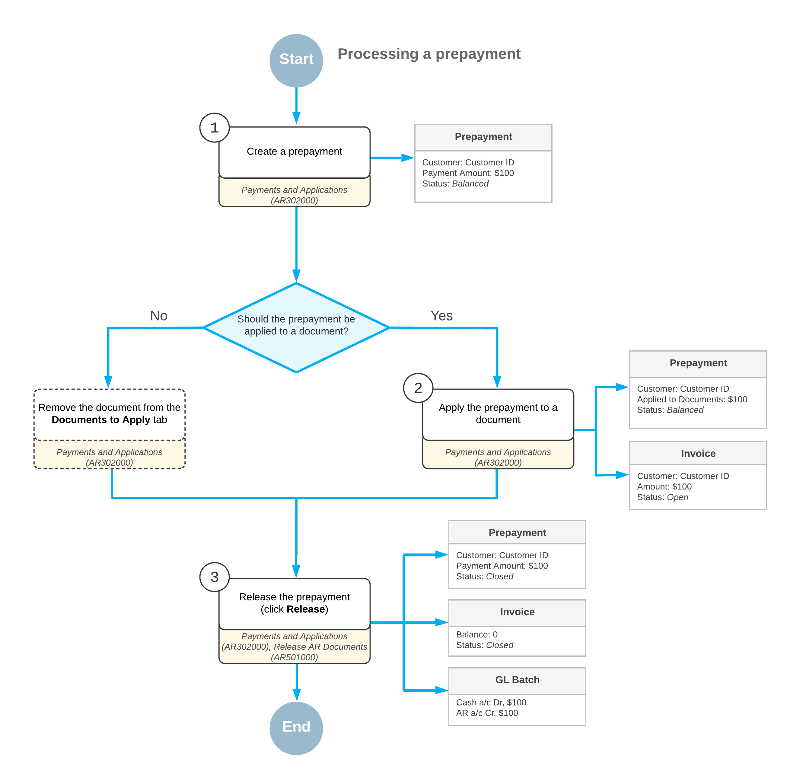 A prepayment is a type of manual AR document (that is, a document created by a user) that records a company's financial relationship with customers. You use this document type if you want to distinguish customer payments from prepayments. The system displays the sum of all open customer payment documents with the Prepayment type separately in the Prepayment Balance box on the Customers (AR303000) form. Also, balances of open prepayments decrease the customer's balance. You can apply outstanding documents to a prepayment before or after you release it.