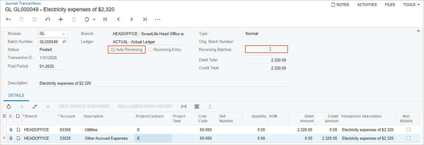Suppose that by the end of January 2025, the electricity used by the SweetLife Head Office and Wholesale Center in January has not yet been billed by the vendor. Acting as a SweetLife accountant, you need to create an auto-reversing batch for the amount of $2,320, which will be posted on January 31 and reversed at the beginning of the next financial period.