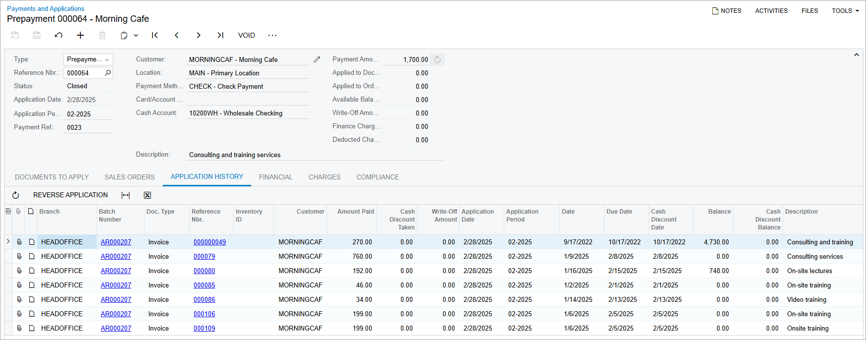 - Locate the prepayment for the Morning Cafe customer in the amount of $1,700 and click the link in the Reference Nbr. column.