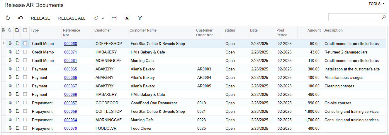 - Open the Release AR Documents (AR501000) form.