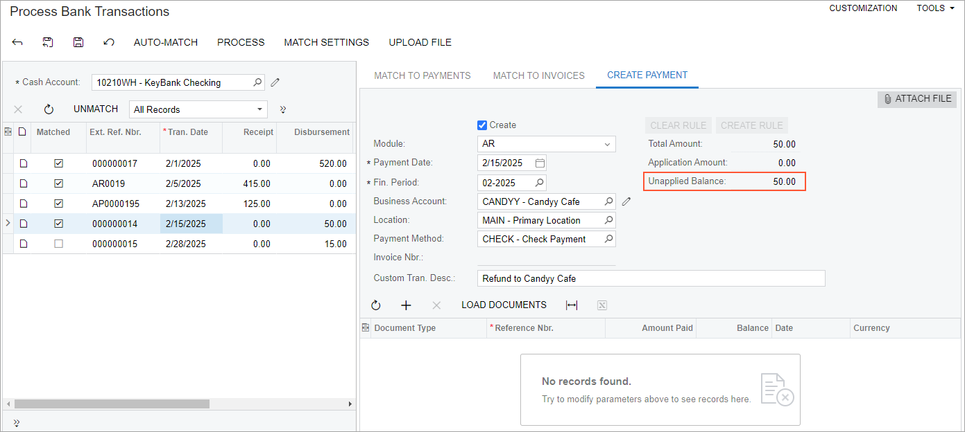 Notice the $50 amount in the Unapplied Balance box in the Summary area. When the system creates an AR refund based on the disbursement transaction, the document with the Refund type will not be applied to any document and will have an open balance, as shown in the following screenshot.