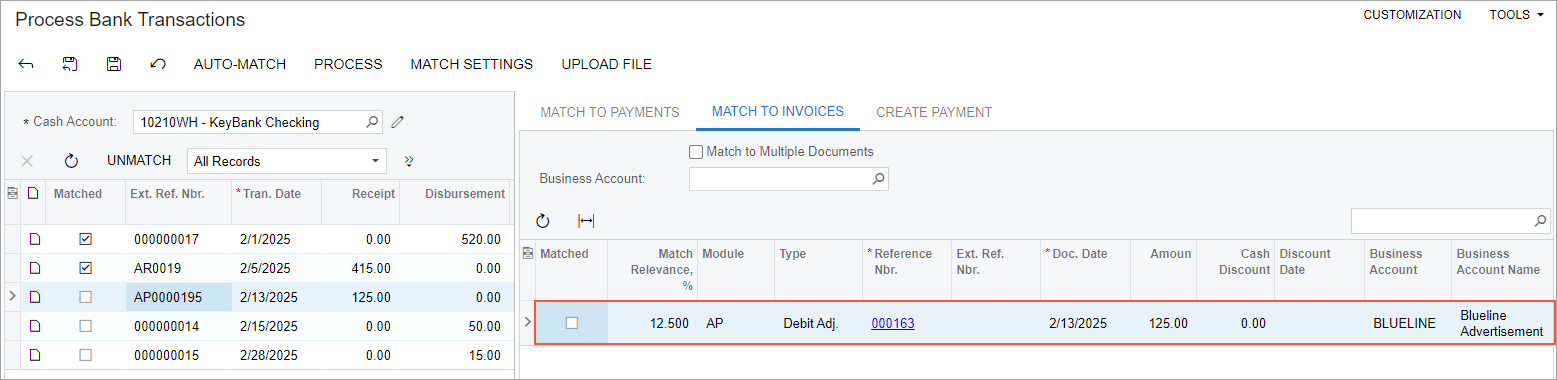 To match a $125 receipt transaction to a debit adjustment, while remaining on the Process Bank Transactions (CA306000) form, do the following: