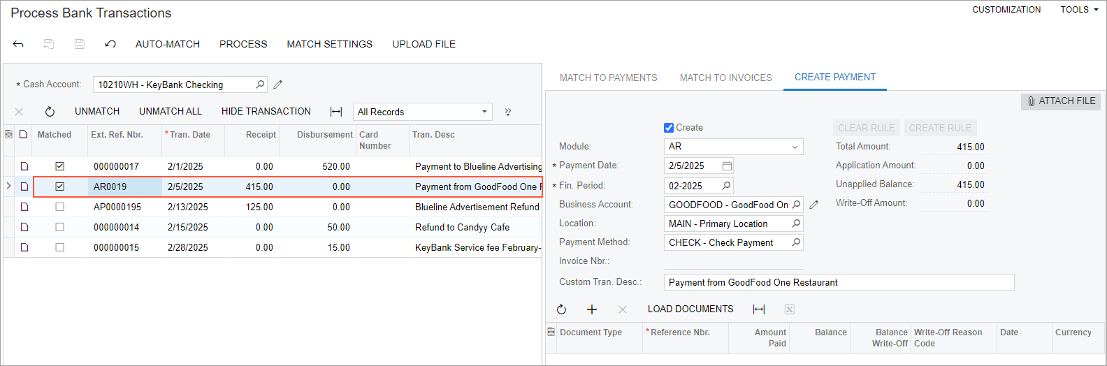 The $415 payment transaction has the Matched check box selected because you have specified the information from which the system will create a payment when you run the processing of transactions. The following screenshot shows the matched transaction.
