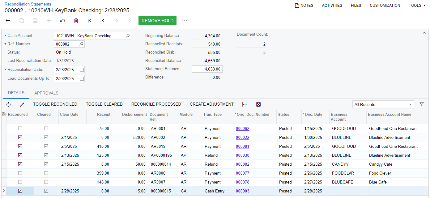 - On the form toolbar, click Remove Hold and then click Release to release the reconciliation statement.