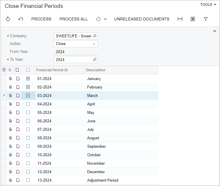 Suppose that as an accountant of the SweetLife Fruits & Jams company, you have to close the 03-2024 financial period and the preceding periods in the accounts receivable subledger for the SweetLife Head Office and Wholesale Center branch to prevent users from posting to these periods.