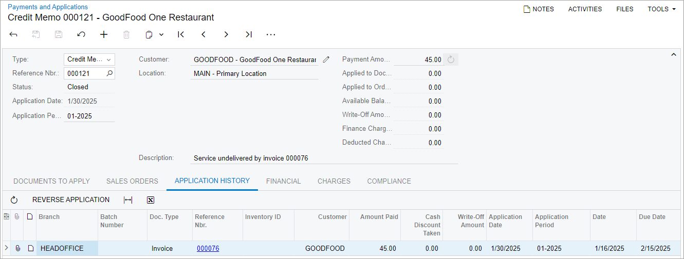 Suppose that on January 16, 2025, the SweetLife Fruits & Jams company sold five days of online training to one of its customers, GoodFood One Restaurant, in the amount of $225. An AR clerk created an invoice for five days of training for GoodFood One Restaurant. The actual number of training days turned out to be four, and now SweetLife needs to reduce the customer balance of GoodFood One Restaurant by $45.