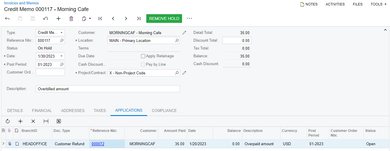Suppose that SweetLife Fruits & Jams overbilled one of the customers, Morning Cafe, and received a payment in the amount of $35. An AR clerk has already created a refund for the needed amount. Acting as a SweetLife accountant, you need to decrease the customer's balance by creating a credit memo and applying the $35 refund to it.