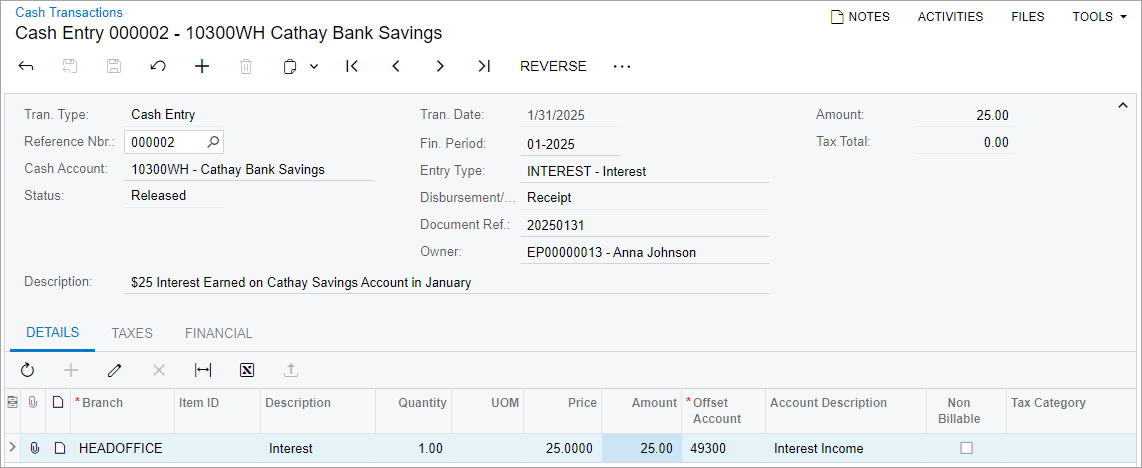 On January 31, 2025, SweetLife earned $25 in bank interest on the 10300WH (Cathay Bank Savings) account. As a SweetLife accountant, on January 31, you need to create a cash entry of the Receipt type to account for this amount.