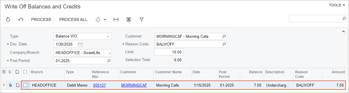 The debit memo that has the $7 balance appears in table (see the screenshot below), because the form shows the documents of this customer that have a balance no greater than the amount specified in the Limit box, which by default contains the Write-Off Limit amount specified for the customer.