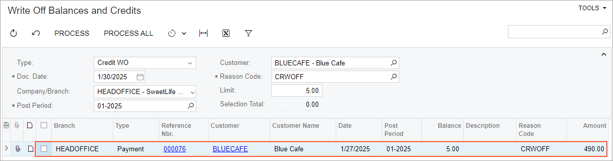 Suppose that while looking through customer accounts, the chief accountant of SweetLife Fruits & Jams noticed that the BLUECAFE customer had a small credit balance of $5. The accountant decided to write it off. Previously, write-offs were made allowed for this customer and the write-off functionality has been set up.