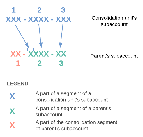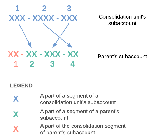 Consider an example when the parent company subaccount has four segments, the first of which is a consolidation segment not involved in mapping (as shown in the illustration below). The subaccount of the consolidation unit consists of three segments. Each segment of the consolidation unit can be mapped to a same-meaning segment of the parent even though the lengths of the segments are different. The first segment of the parents subaccount is a consolidation segment.