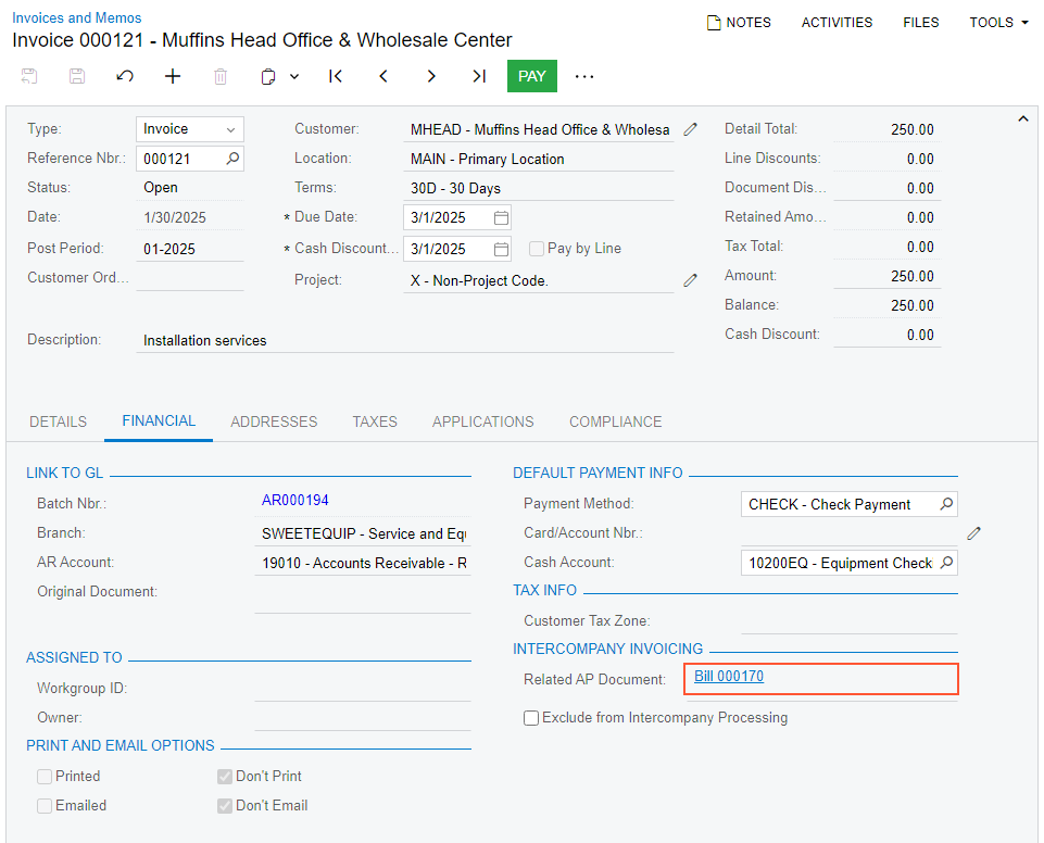 - On the Financial tab, click the Edit button to the right of the Related AR Document box (Intercompany Invoicing section), and review the invoice that opens on the Invoices and Memos form.