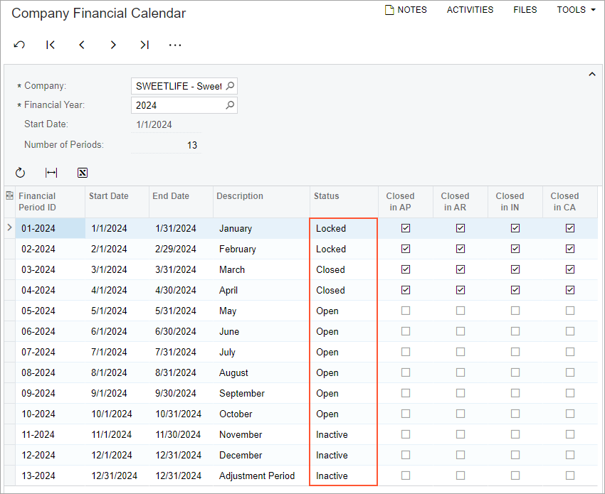 If periods have been opened by mistake, to prevent posting to these periods, you can deactivate these financial periods for the master calendar or a company calendar on the Manage Financial Periods (GL503000) form.