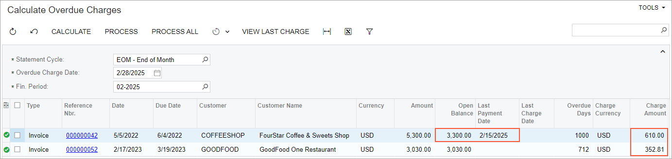 Overdue Charge documents.Tip: If the system finds an unreleased overdue charge document for an invoice during overdue charge processing, the invoice is marked with an error and no new overdue charge document is created. You can select this invoice and click View Last Charge on the form toolbar to view and release the existing overdue charge document. Then you can calculate and process overdue charges for this invoice again.