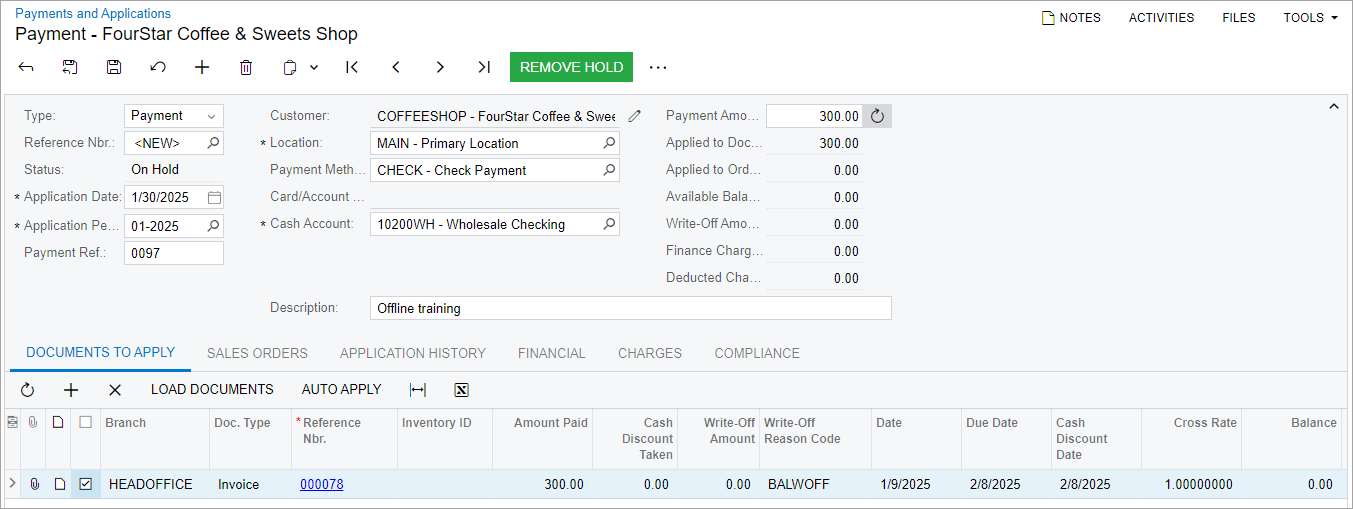 In this activity, you will find the needed invoice on the Invoices and Memos (AR301000) form and click Pay on the form toolbar to create a payment for it on the Payments and Applications (AR302000) form. You will then apply this payment to the invoice and release the payment with its application to the invoice.