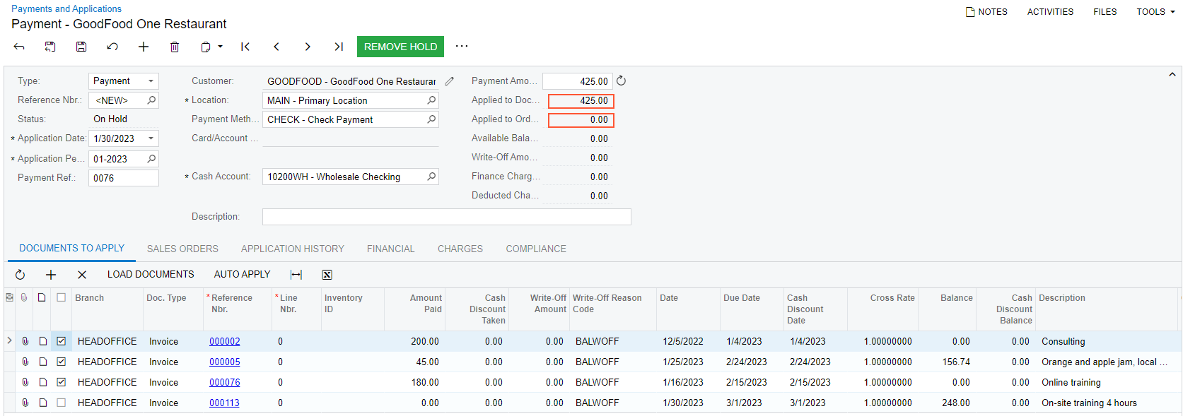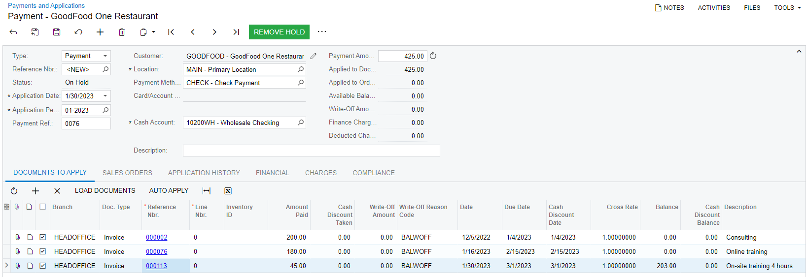 While still on the Payments and Applications form, you will enter a payment from a customer, review how the system automatically loads the AR documents to which the payment can be applied, and then explore how the payment amount can be automatically applied to the loaded documents.