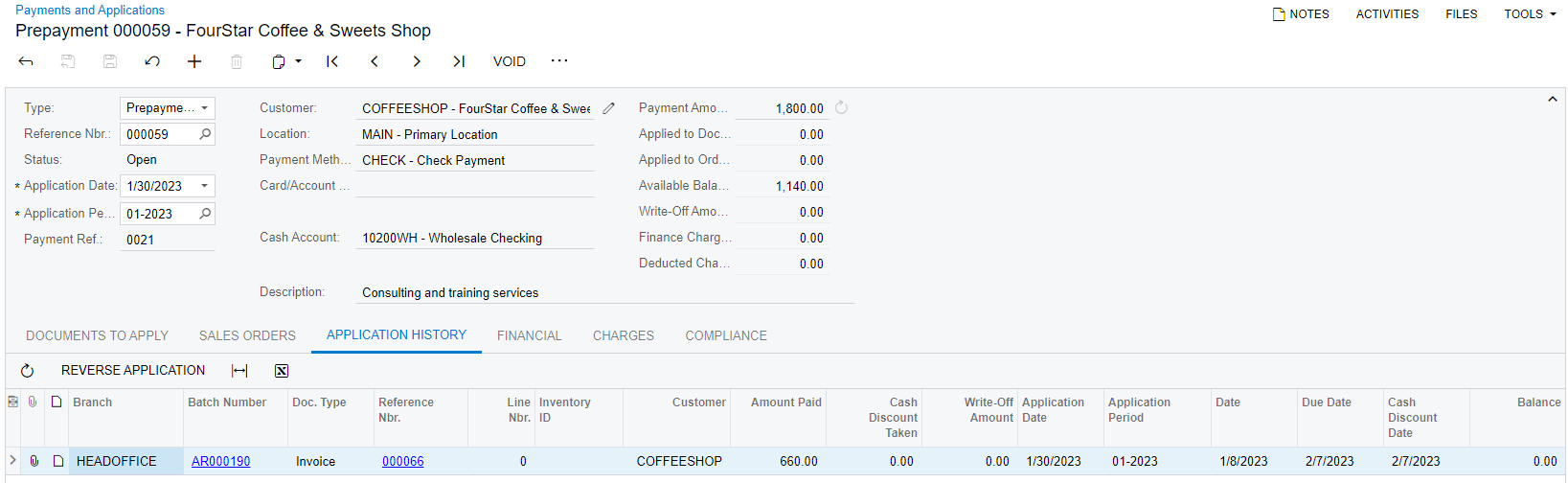 The invoice has been paid in full (660 has been applied to it, as shown in the Amount Paid column), and the prepayment still has 1140 of available balance (displayed in the Available Balance box of the Summary area).