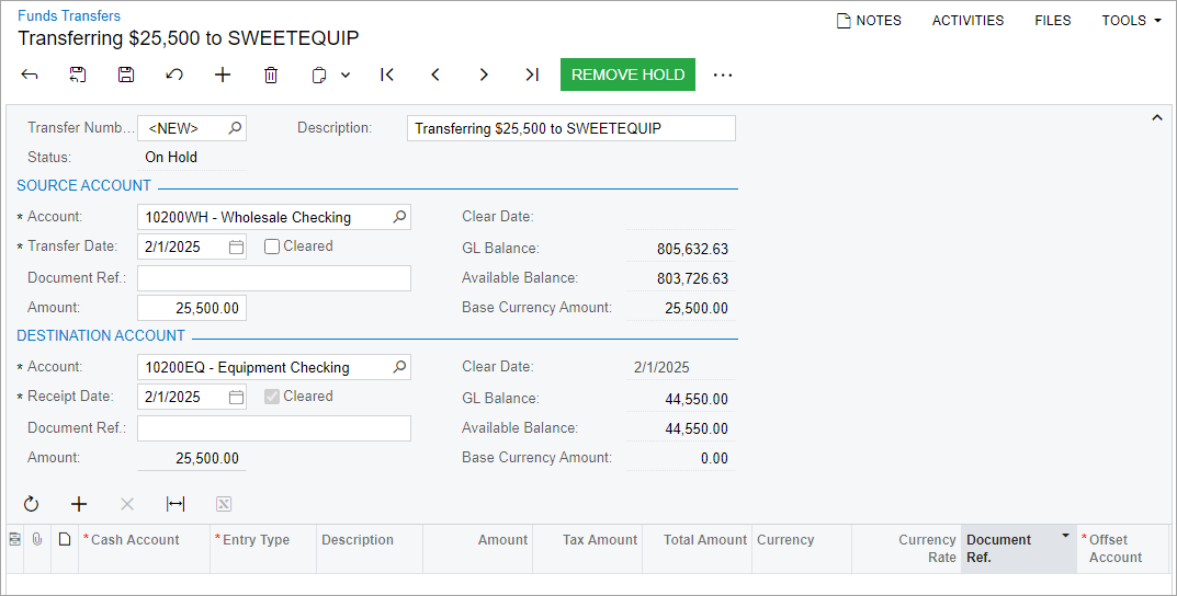 - On the form toolbar, click Remove Hold, and then click Release to release the funds transfer.