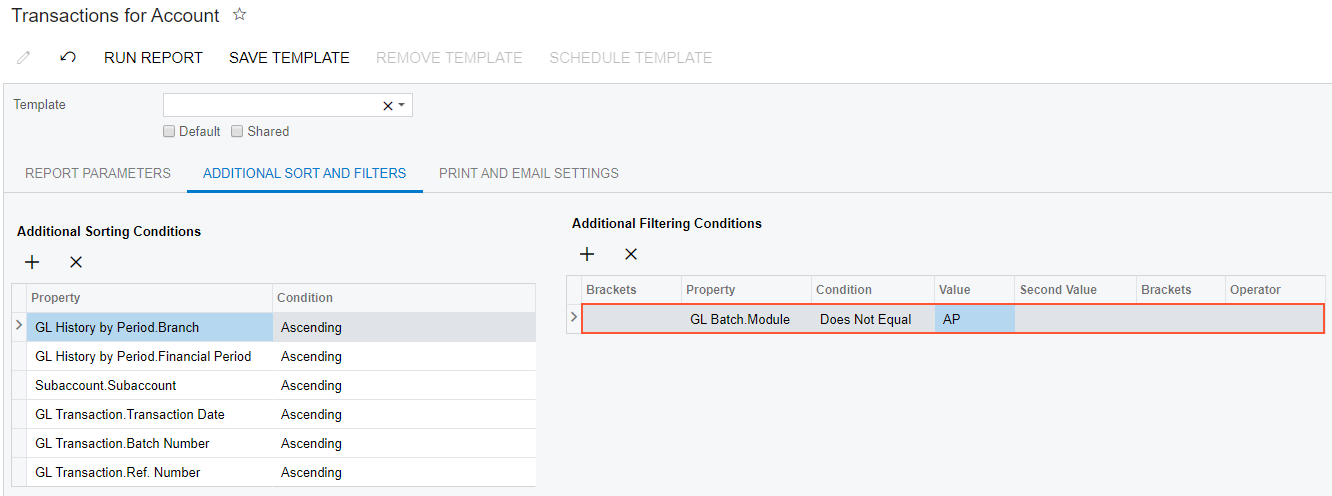 - Additional Sort and Filters tab, Additional Filtering Conditions: Property: GL Batch.Module, Condition: Does Not Equal, Value: AP.