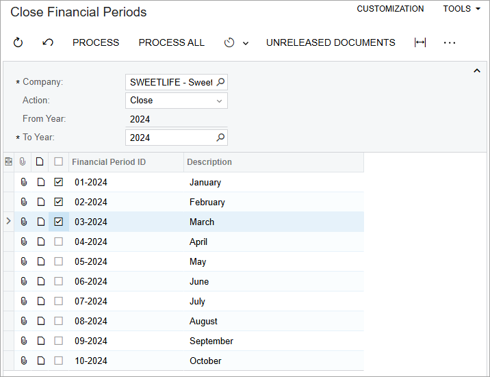 Suppose that it is the end of March 2024, all the documents of the SweetLife Fruits & Jams company have been posted, and the financial period has to be closed to prevent system users from posting to this period.