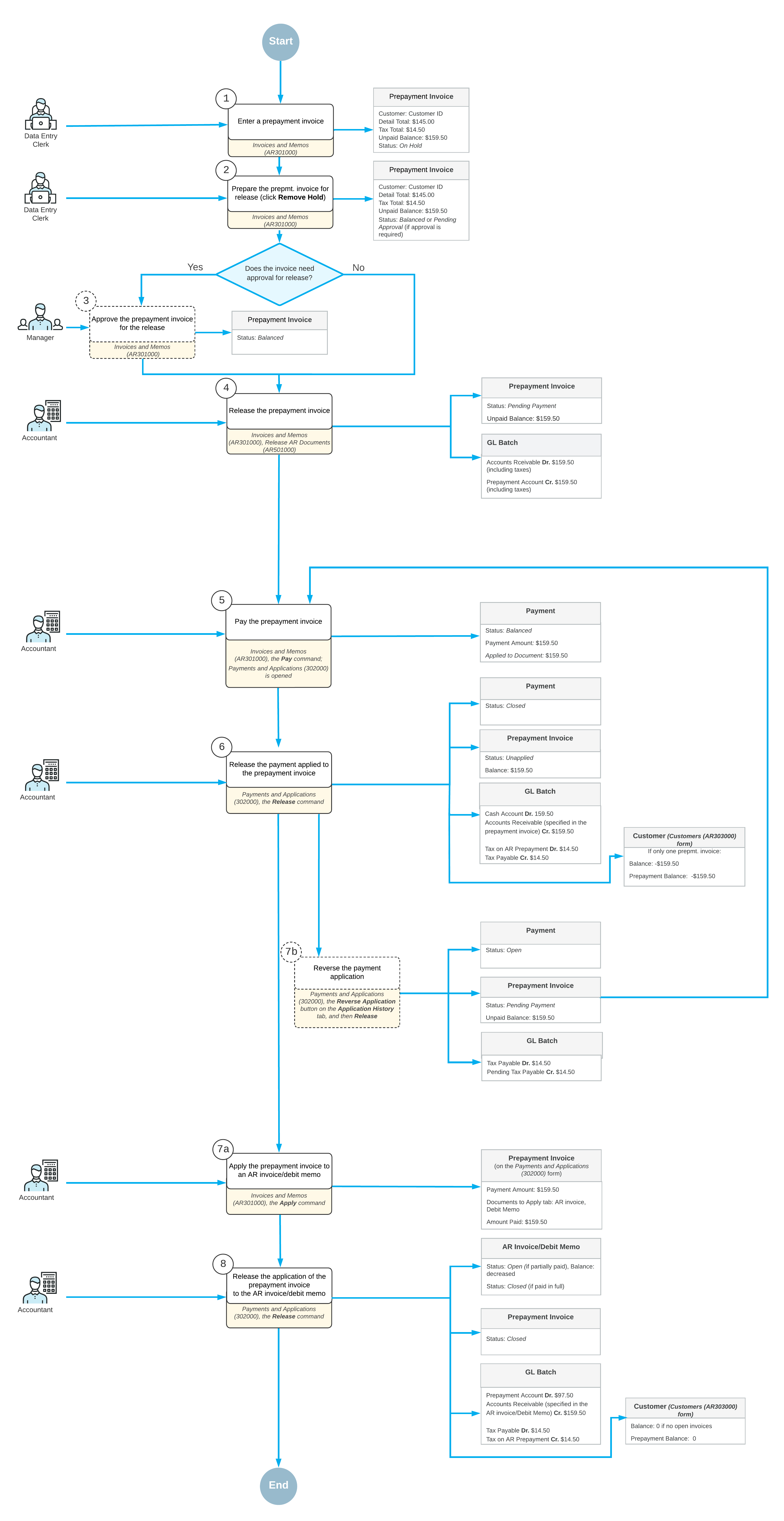 First, a data entry clerk creates a new prepayment invoice on the Invoices and Memos (AR301000) form (see Item 1 in the diagram). The prepayment invoice is assigned the On Hold status if the Hold Documents on Entry check box is selected on the Accounts Receivable Preferences (AR101000) form or approvals have been set up for prepayment invoices. The system assigns the reference number to the prepayment invoice based on the numbering sequence specified in the Prepayment Invoice Numbering Sequence box on the Accounts Receivable Preferences form.