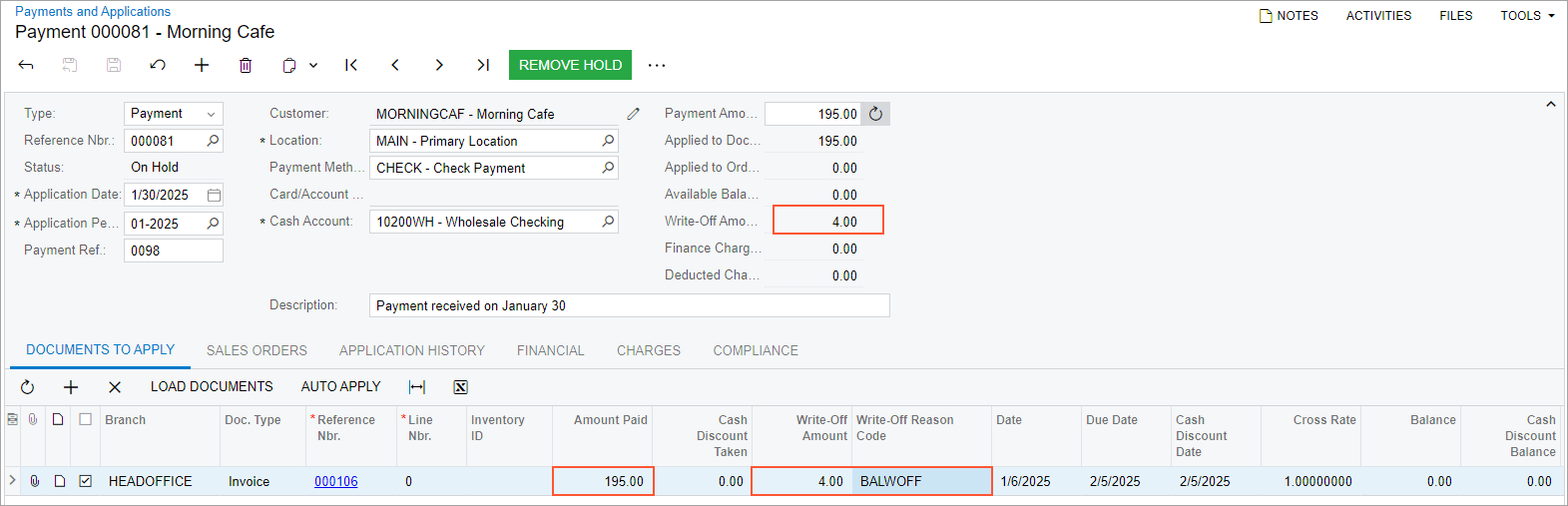 - Review the Summary area of the form. The Applied to Documents box now displays 195.00, the Write-Off Amount box displays 4.00, and the Available Balance box displays 0.00.