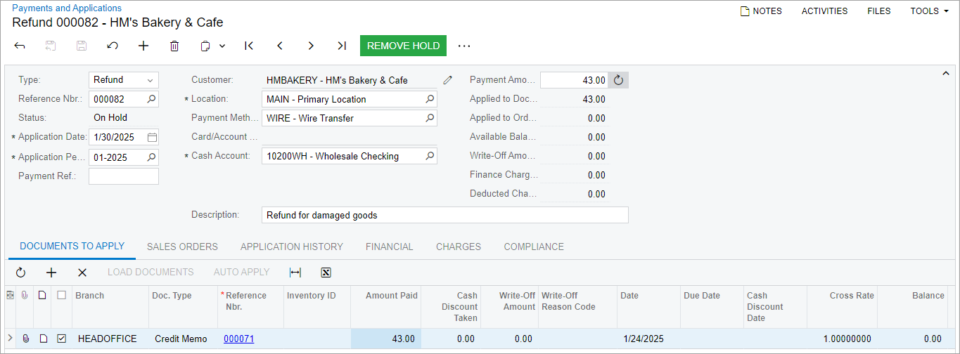 - While you are still viewing the refund on the Payments and Applications (AR302000) form, on the form toolbar, click Remove Hold, and then click Release.
