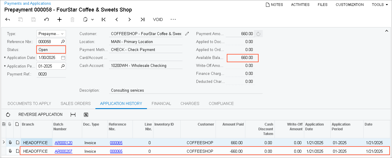 The system creates a reversing batch that you can see on the Application History tab. The system also sets the statuses of the invoice and the prepayment to Open and increases their balances by $660, as shown in the following screenshot.