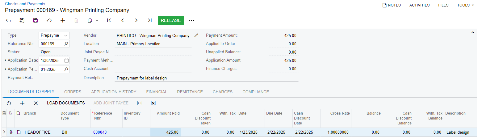 - On the form toolbar, click Release to release the prepayment application to the bill.