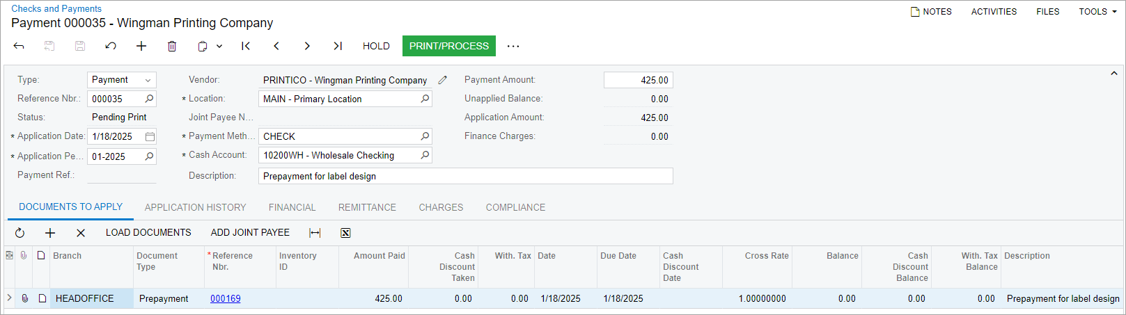 Suppose that the SweetLife Fruits & Jams company has ordered a new design for the company's printed labels and paper bags from Wingman Printing Company. They requested an advance payment of $425 for these services. Further suppose that the prepayment that SweetLife made on January 18, 2025 has to be applied to an AP bill from Wingman Printing Company.