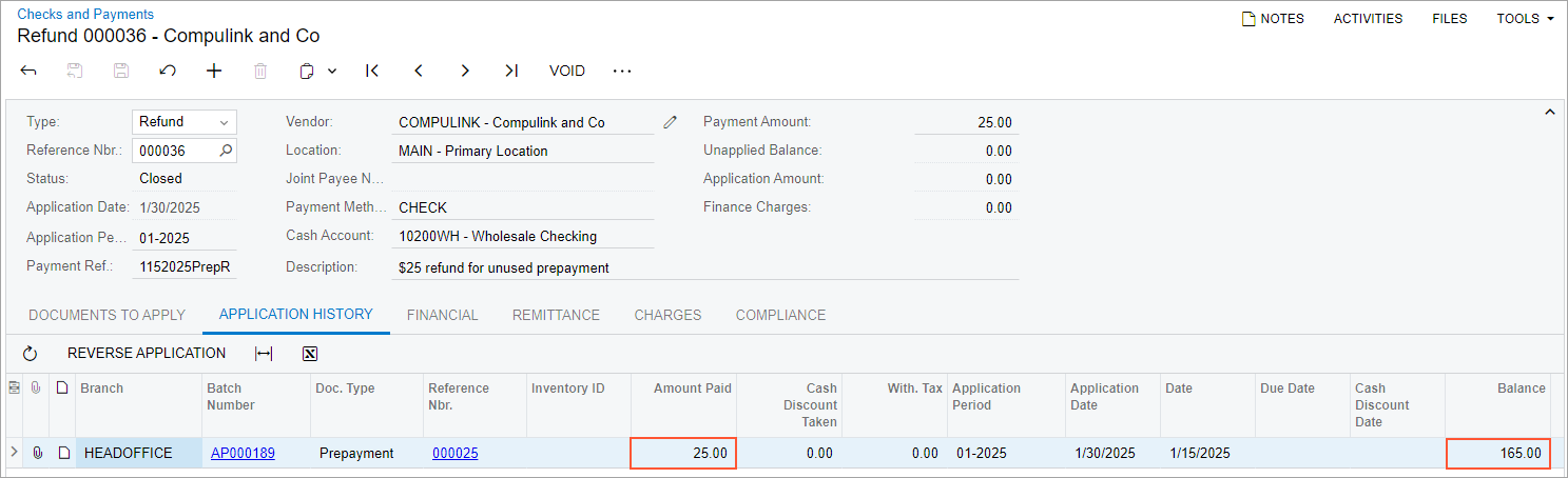 On the Application History tab, the released refund applied to the prepayment has appeared (see the following screenshot). The amount of the refund is shown in the Amount Paid column whereas the Balance column shows the balance of the prepayment.