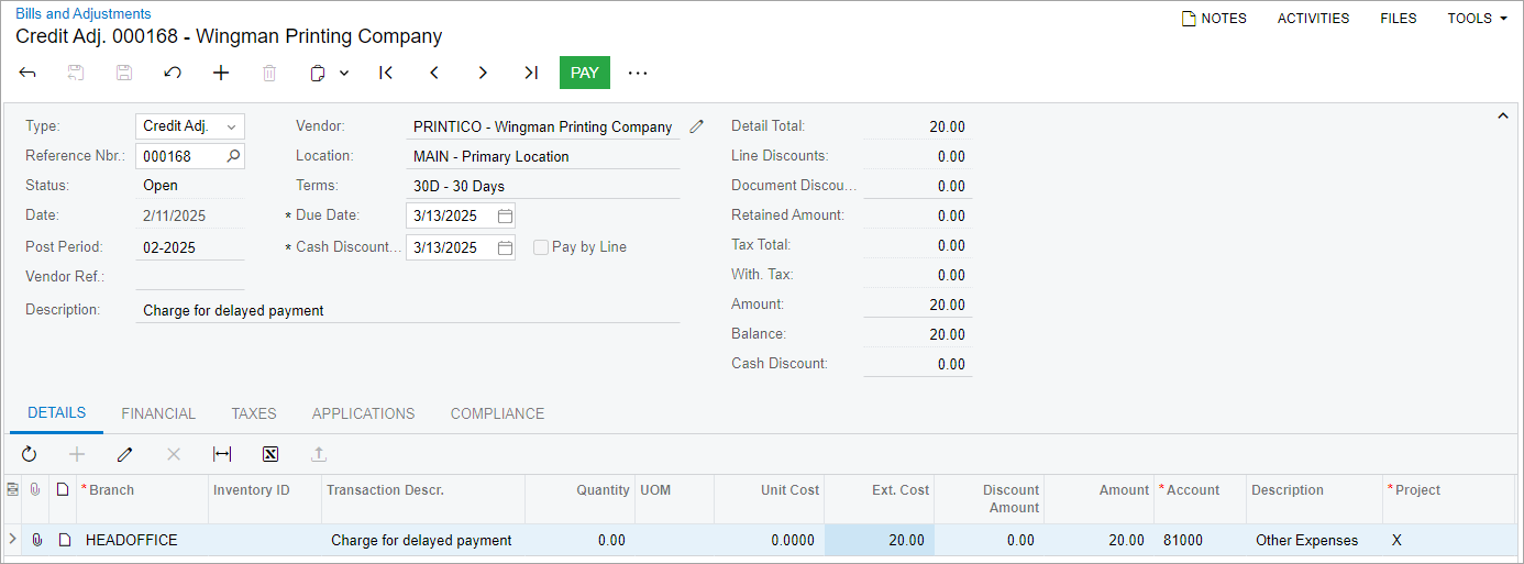 In this activity, you will create and release a credit adjustment on the Bills and Adjustments (AP301000) form.