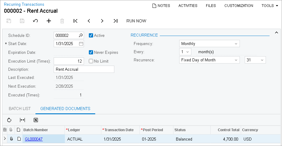 - In the table that displays recurring transaction schedules, select the unlabeled check box in the row of the only schedule, and click Run on the table toolbar to generate the batch according to the schedule.