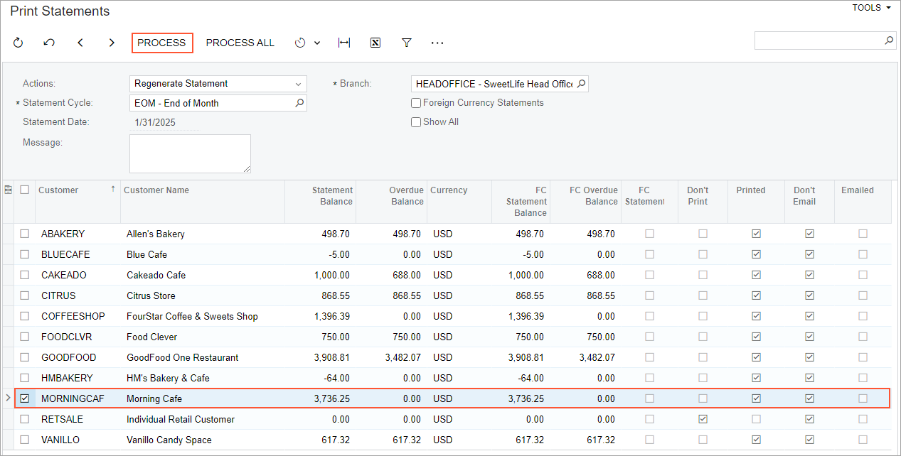 - Select the unlabeled check box for the MORNINGCAF customer statement and