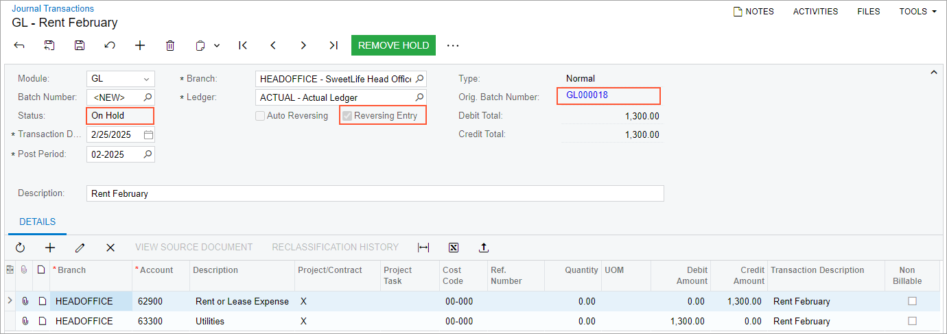 The system generates and opens a reversing batch. In the Summary area, notice that the number of the original batch is shown in the Orig. Batch Number box, the Reversing Entry check box is selected, and the batch's status is On Hold, as shown in the following screenshot.