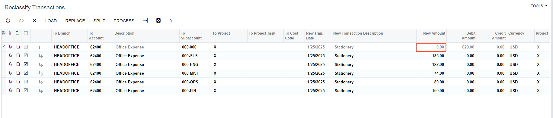 Suppose that on January 25, 2025, a GL batch for $620 was posted to the 62400 - Office Expenses account and to the general 000-000 subaccount. The accountant then decided to split expenses between different departments so that reports would reflect the expense breakdown by departmental subaccounts. The departments in this batch have the following office expenses: