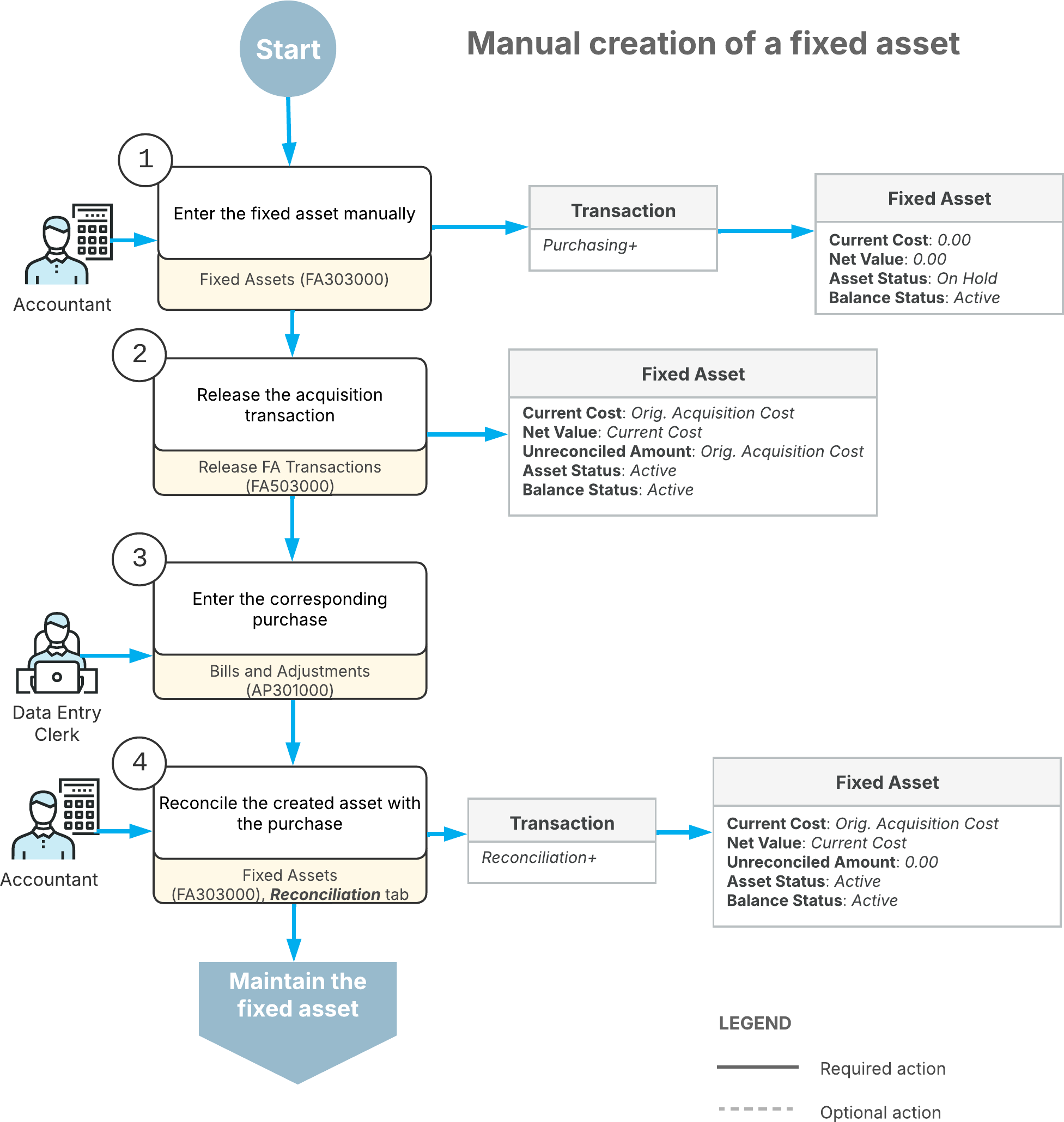 As the diagram shows, manually creating a fixed asset involves these steps:
