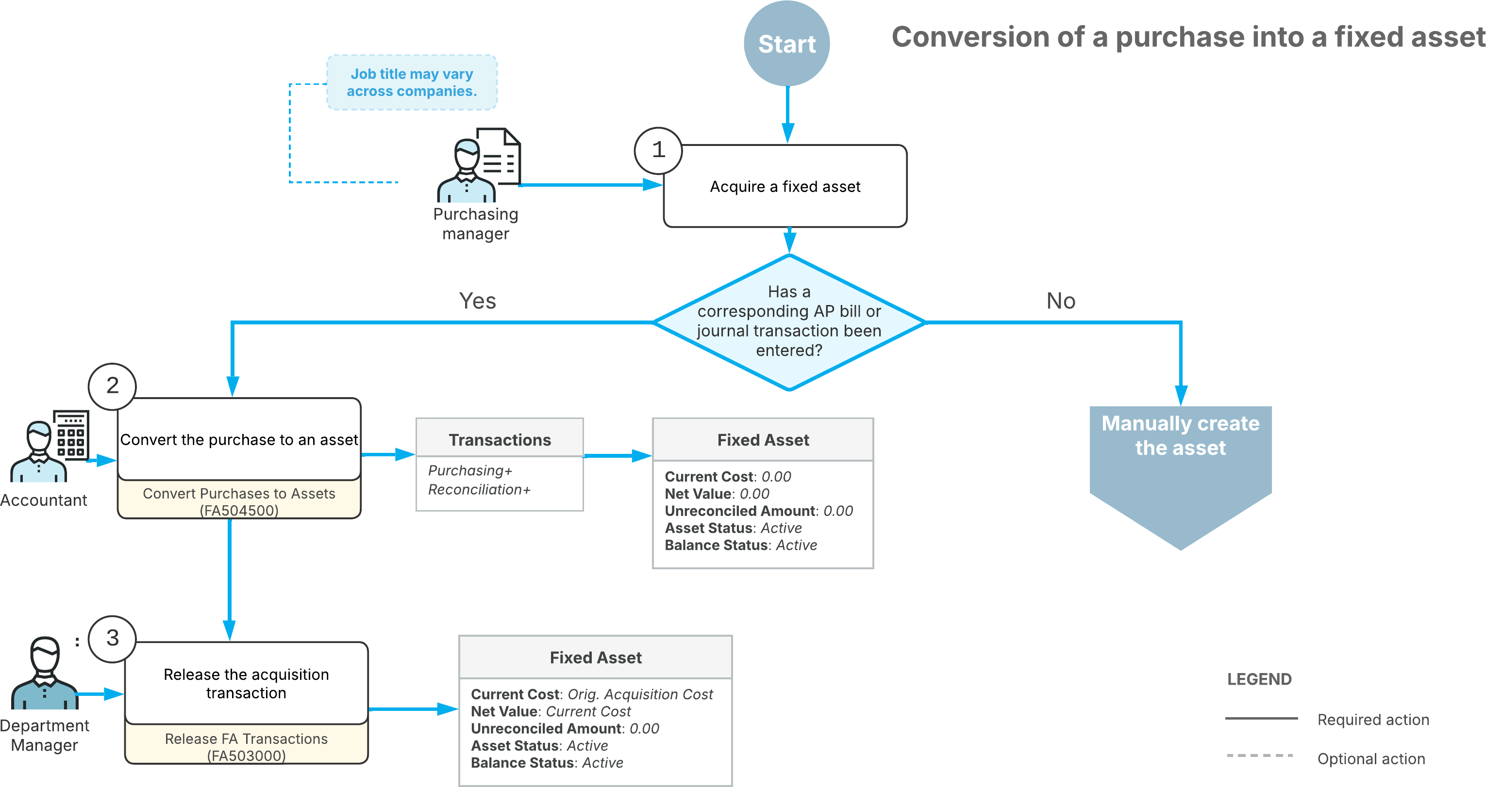 The following diagram shows the conversion of a purchase into a fixed asset.